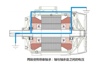 軸與軸承座之間的電壓——如果電壓發(fā)生在軸與軸承座之間,電流會以相同方向通過每個軸承,這主要是用于變頻器帶來的共模電壓所致。在這種情況下,電機兩端的軸承都應(yīng)該被絕緣。如下圖所示: