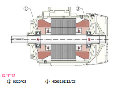 在該感應電機的的風扇端使用一套表面噴涂絕緣深溝球軸承 HC6316EI12/C3,驅動端使用一套普 通深溝球軸承 6320/C3,如下圖所示。帶絕緣層的深溝球軸承切斷了沿軸產(chǎn)生的感應電壓引起的電流回路,兩端軸承采用脂潤滑,需安裝再潤滑裝置。